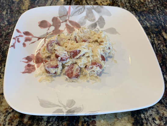 Slice up the brats into bite size pieces and add them to the pot of cheesy kraut