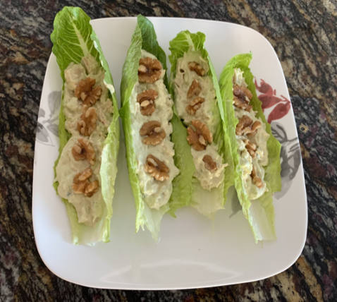 Spoon the chicken salad into the lettuce leaves and top with the walnuts